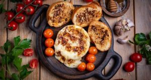 Выложите ломтики багета на тарелку и обмажьте каждый из них плавленым сыром: сливочным или "Дружба". По желанию сыр можно заменить густым соусом на сметанной, сливочной основе.