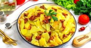 Описание приготовления: Чтобы подчеркнуть грибной вкус и аромат, не забудьте и про репчатый лук. Его мелкая нарезка при жарке приобретет легкую сладость и грибы ярче раскроются. Сначала обжарьте картофель, так как он самый плотный из ингредиентов. Затем добавьте лук, обжарьте его еще 3-4 минуты и лишь после этого добавляйте грибы. Их нарезка должна быть небольшой, чтобы все продукты отлично приготовились. ...