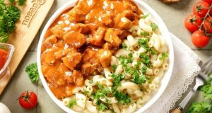 Описание приготовления: Сытное полноценное блюдо, которое можно подать на обед или ужин. У меня сегодня гуляш из свинины, но вы можете приготовить его из говядины или из любого другого мяса без костей и прожилок. Мясо обжарим до золотистой корочки, добавим лук, муку, а потом потомим на маленьком огне в томатном соусе. Получится ароматно, питательно и очень вкусно! Макароны отварим отдельно, ...