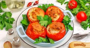 Описание приготовления: Запеченные помидоры с фаршем получаются сочными и аппетитными, главное — не слишком долго запекать их, чтобы они не потеряли свою форму. Можно в конце приготовления присыпать блюдо тертым сыром и запечь еще 3-4 минуты. За это время сыр расплавится и помидоры приобретут аппетитную сырную "шапочку". Добавляйте в фарш куриное яйцо — оно "скрепит" начинку и она не распадется ...