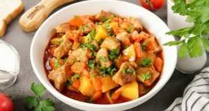 Описание приготовления: Будничное блюдо, которое порадует вас не только простотой приготовления, но и изумительным вкусом — оценит вся семья. Подойдёт любая часть свинины — окорок, карбонад или вырезка. Мне нравится ошеек, так как мясо там нежное и пожирнее. Томатную пасту, если её вдруг не оказалось под рукой, можете заменить мясистыми помидорами. Специи берите на своё усмотрение, те, что больше любите. ...