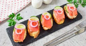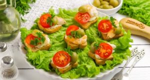 Не обязательно при запекании добавлять помидорки черри, а вместо багета можно использовать чиабатту или просто обычные кусочки батона.