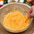В муку натираем на крупной терке масло, быстро смешиваем компоненты. В углубление в муке вливаем холодную яичную смесь, руками собираем тесто в колобок.