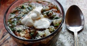 Консистенция супа должна быть приблизительно такой. Если хотите более жидкую — добавляйте бульон, более густую — муку.