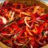 Подготовьте вкусовую основу супа. Красный острый перец разрежьте вдоль и удалите сердцевину. Измельчите корень имбиря (галангала). Нарежьте зеленый лук. Крупные грибы и помидоры черри разрежьте пополам, мелкие можно оставить целиком.